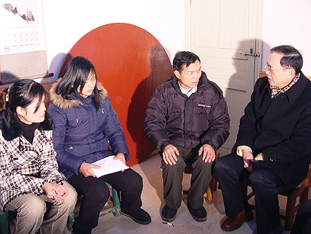 2008年2月5日,太保集團總經理霍聯(lián)宏冒著嚴寒趕到熊大勇家中慰問英雄的父 母,代表全體太保干部員工向英雄父母致敬(從右至:霍聯(lián)宏、英雄父親、英雄母親、英雄姐姐)。