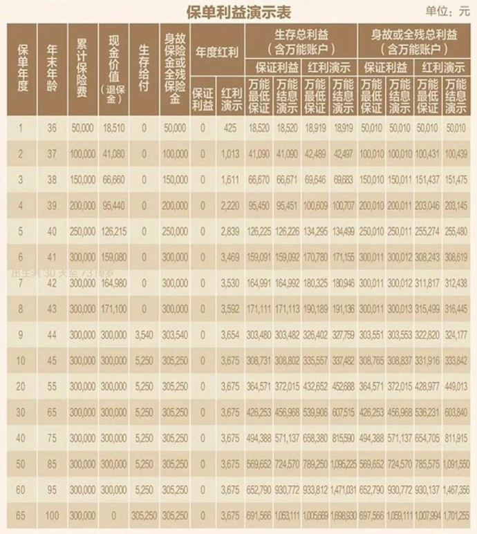 注:1.紅利分配分別按保證利益、紅利演示2種情況進行預(yù)測,僅作為參考之用。紅利演示不作為未來紅利分配的保證,實際紅利水平可能高于或低于表中所列數(shù)字;2.為了便于說明,假定合同生效日為1月1日;3.累積紅利的累積利率為1.75%,是假設(shè)值,公司每年公布的累積利率可能高于或低于該利率;4.以上演示的被保險人年齡、生存給付(包含祝福金、滿期金)為保單年度末且經(jīng)過完整保單年度的值;5.現(xiàn)金價值(退保金)、身故保險金為保單年度末且經(jīng)過品整保單年度的值,保單年度中的現(xiàn)金價值(退保金)、身故保險金可能高于或低于該數(shù)值,現(xiàn)金價值(退保金)不包含當(dāng)年給付的祝福金及滿明保險金;6.萬能賬戶價值按照假設(shè)的結(jié)算利率計算,最低保證、結(jié)息演示兩檔的結(jié)算利率假設(shè)分別為1.0%(最低保證利率)、3.0%,萬能臉的最低保證利率之上的投資收益是不確定的,實際保單賬戶利益可能低于萬能結(jié)息利益演示水平;7.合同生效日對應(yīng)日派發(fā)的相關(guān)利益計入上一保單年度末;8.演示數(shù)據(jù)保留整數(shù)。